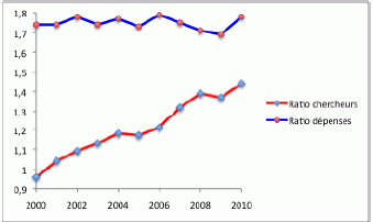 Figure 2 : Ratio secteur privé/secteur public pour le nombre de chercheurs et pour les dépenses R&D