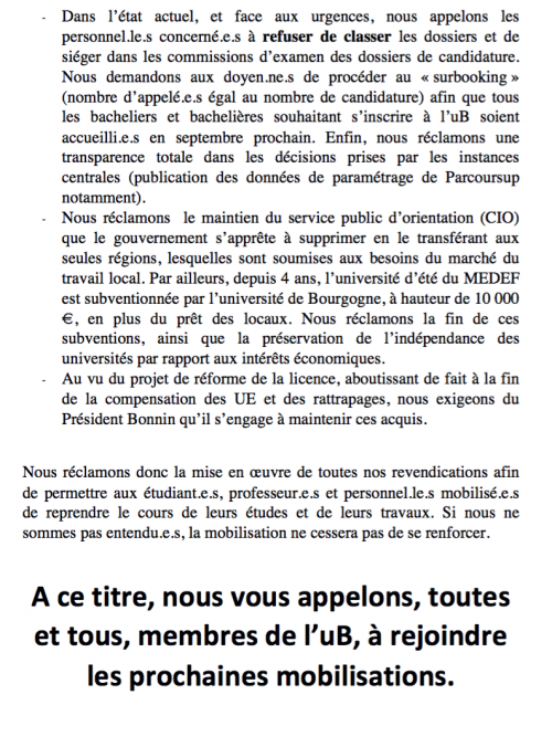 "Nous, enseignants et étudiants du Département d’Histoire de l’Université de Bourgogne réunis en Conseil, exprimons notre indignation devant l’intervention policière aussi inutile que disproportionnée qui a eu lieu au sein du bâtiment droit-lettres de l’université le vendredi 16 mars 2018.