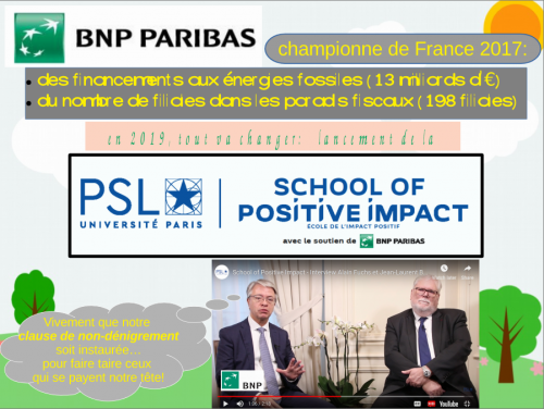 Cette semaine devrait être soumis au CA de PSL l’approbation d’une nouvelle formation qui va enfin révolutionner la science. Rien de ce que vous faisiez jusqu’à présent, jeunes étudiants et vieux scientifiques enseignants, n’avait de sens. Tout change désormais grâce à la BNP et à PSL ! Entrez dans l’ère du "positive impact" !